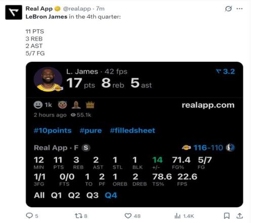 41岁的勒布朗才统治攻防的存在,他在末节打满12分钟,湖人从落后14分到反超他是见证者,湖人在短短5分45秒里打出27-6,詹姆斯全程参与,防守端抢断、盖帽、限制对手,进攻端7中5+三分1中1拿到11分,没有罚球的情况下,詹姆斯末节+14!